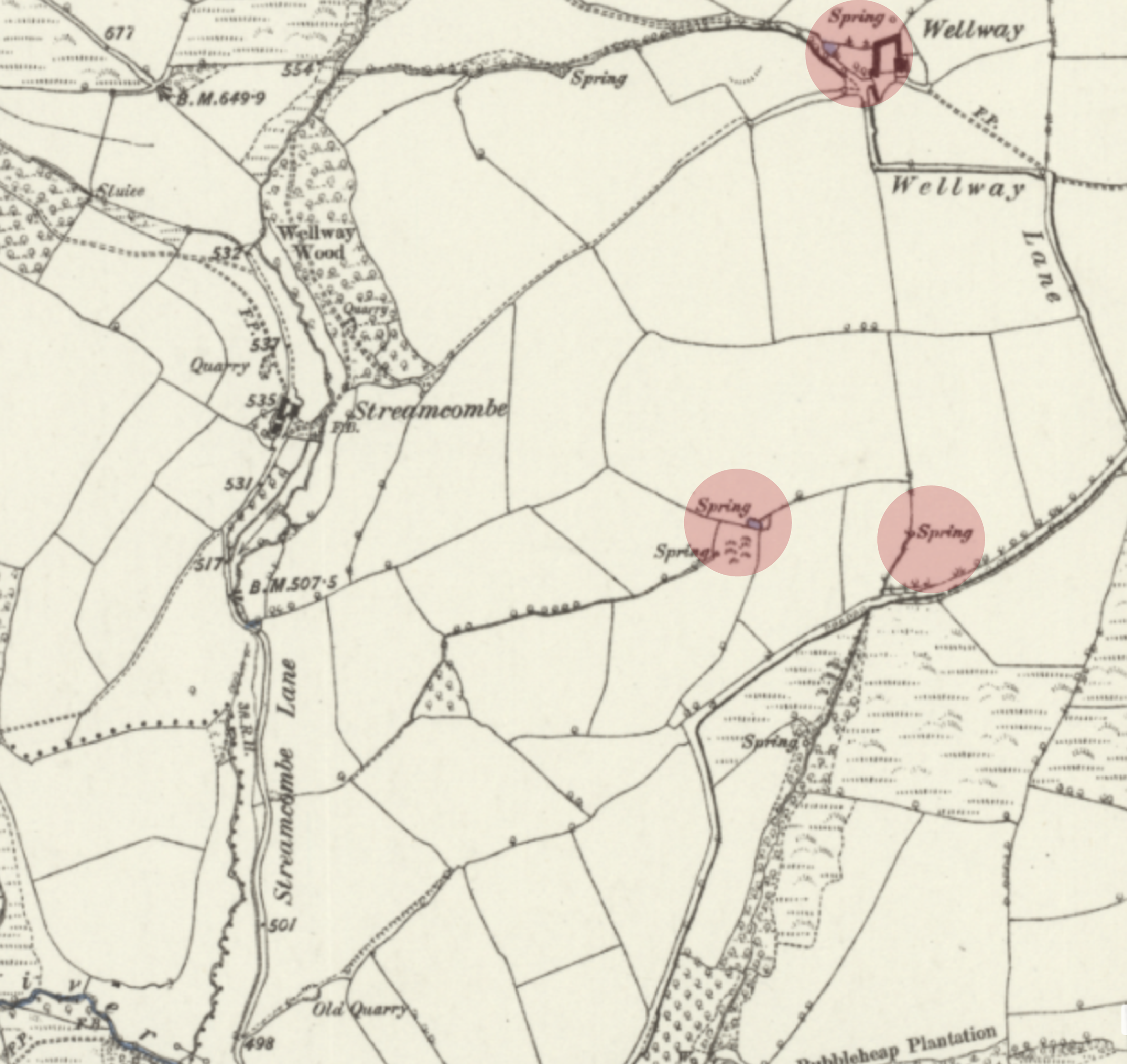 Historic Ordnance Survey mapping records multiple springs in and around the Streamcombe valley. These align closely with groundwater emergence still observed on the site today, indicating a long-established headwater system rather than a recently formed wet area.